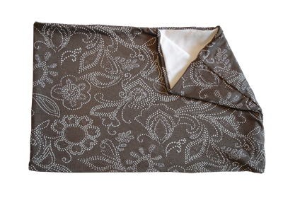 brauner stoff mit blumen- und blättermuster aus weissen und silberfarbenen punkten