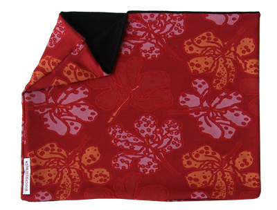 Roter Stoff mit eingewobenem Blumenmuster in Rot-Orange und Lila-Tönen