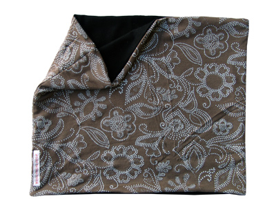 brauner stoff mit aufgedrucktem, gepunktetem blumenmuster in weiss und silbern