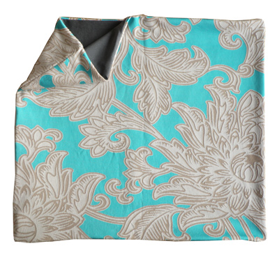 türkisfarbener stoff mit eingewobenem blumenmuster in weiss und beige