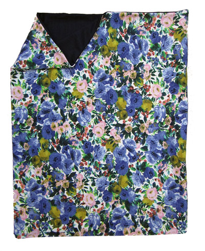 beiger stoff mit aufgedrucktem blumenmuster in senfgrün, blau und rosa
