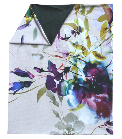 beiger stoff mit üppigem blumenmuster in violett, türkis und lindengrün