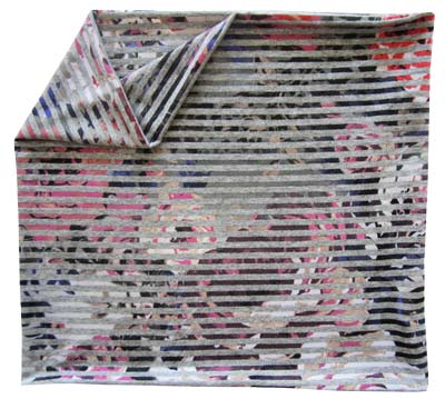 florales ornament in altrosa und grün, überlagert mit einem hellgrauen streifenmuster