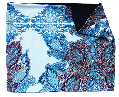 weisser stoff mit cashmirmuster in blau und erdfarben